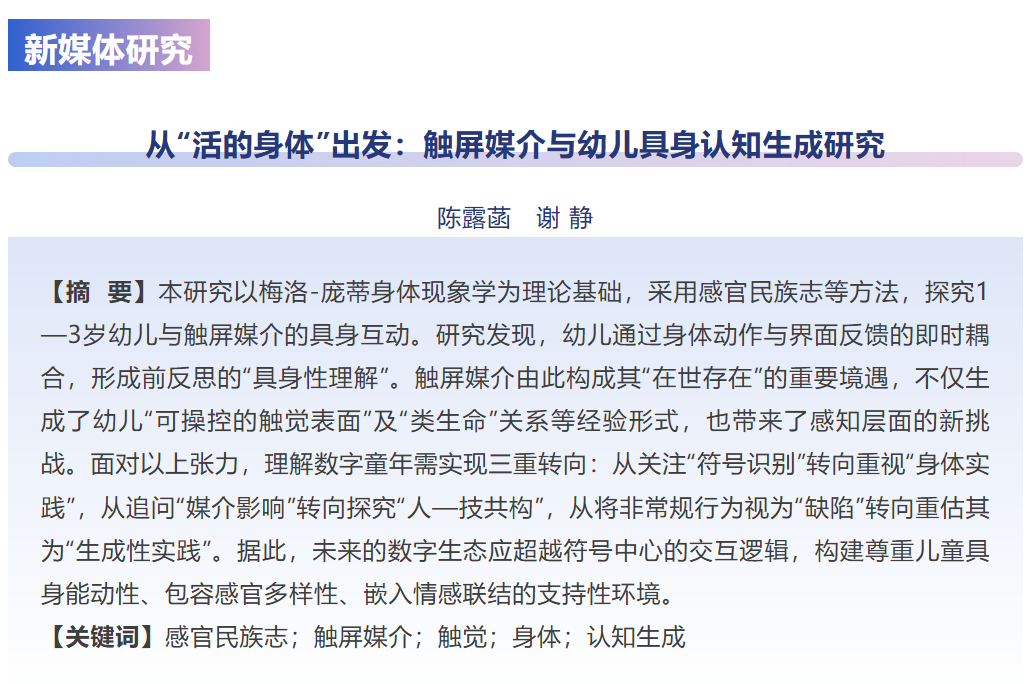 本网讯(文/米仁豪) 近日,best365官网文学与新媒体学院青年教师陈露菡博士在国内新闻传播学知名期刊《新闻大学》2026年第3期发表题为《从“活的身体”出发:触屏媒介与幼儿具身认知生成研究》的学术论文,展现了学院青年学者扎实的科研实力与前沿学术视野。