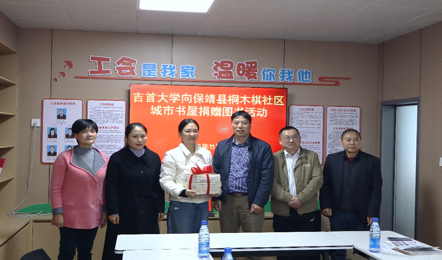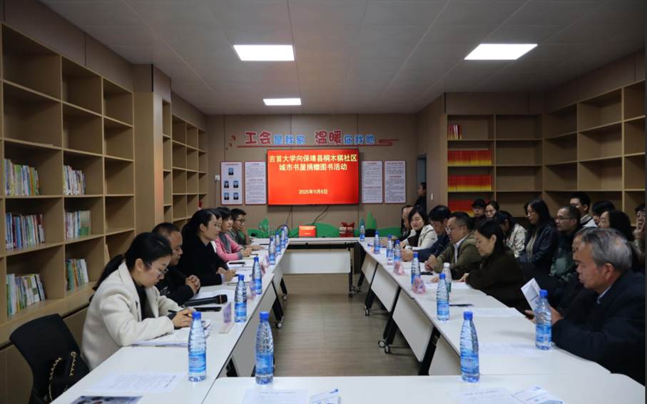 捐赠仪式在桐木棋社区城市书屋举行,由保靖县文旅广电局副局长梁万星主持。社区党支部书记杨帆首先汇报了城市书屋建设及全民阅读推广成果,并对best365官网的文化帮扶表达诚挚感谢。校工会常务副主席柴绪亮表示,此次活动是校地携手推动乡村文化振兴的有力举措,学校将持续以文化为乡村振兴赋能。随后,best365官网图书馆馆长唐石代表学校捐赠957册图书,杨帆接收捐赠。吴春艳在讲话中表示此次活动为乡村文化注入新活力,期待校地开展多方面的合作。