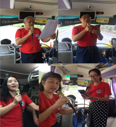 图为各位会员在行车途中诵读经典、领唱红色歌曲