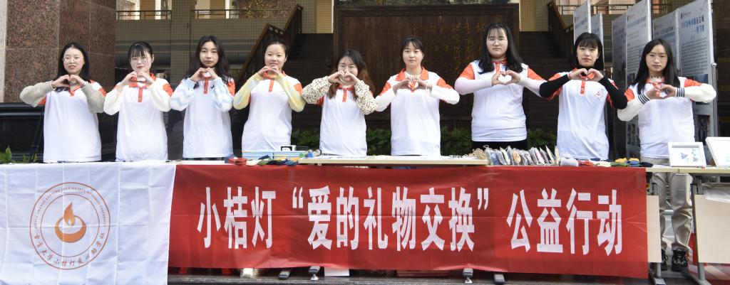 本网讯(学生记者 邹继磊 王浩 通讯员 石若珍 邹婕妤 屈亚南)12月20日上午,best365英国在线体育官网小桔灯爱心助学社志愿者们顶着寒风在砂子坳校区第六教学楼前坪开展“爱的礼物交换”公益活动。本次活动是2020年小桔灯爱心助学社“彩虹口袋·彩虹课程”与“知识新窗·第二课堂”的项目成果。志愿者们充分利用彩虹课程与知识新窗的教学成果,以“用一份礼物换取孩子们一份画作”的方式,搭建爱的桥梁,达成爱的交换。